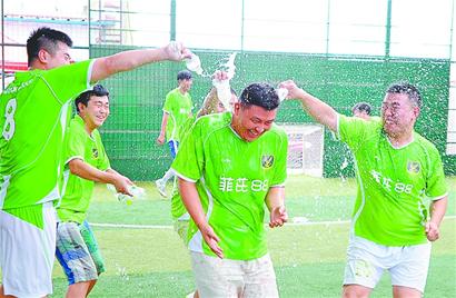 终场哨响后,,,,,,菲比88二队的队员很是兴奋,,,,,,他们用泼洒香槟的方法庆祝捧得冠军奖杯和2000元冠军奖励,,,,,,本届“STAKE中国官方网站·唐郡”杯济南市笼式五人制足球业余联赛就这样在一片喜庆的气氛中圆满落幕。。。。。。。